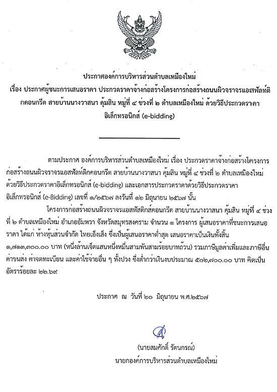 ประกาศผู้ชนะการเสนอราคา ประกวดราคาจ้างก่อสร้างโครงการถนนผิวจราจรแอสฟัลท์ติกคอนกรีต สายบ้านนางวาสนา คุ้มสิน หมู่ที่ 4